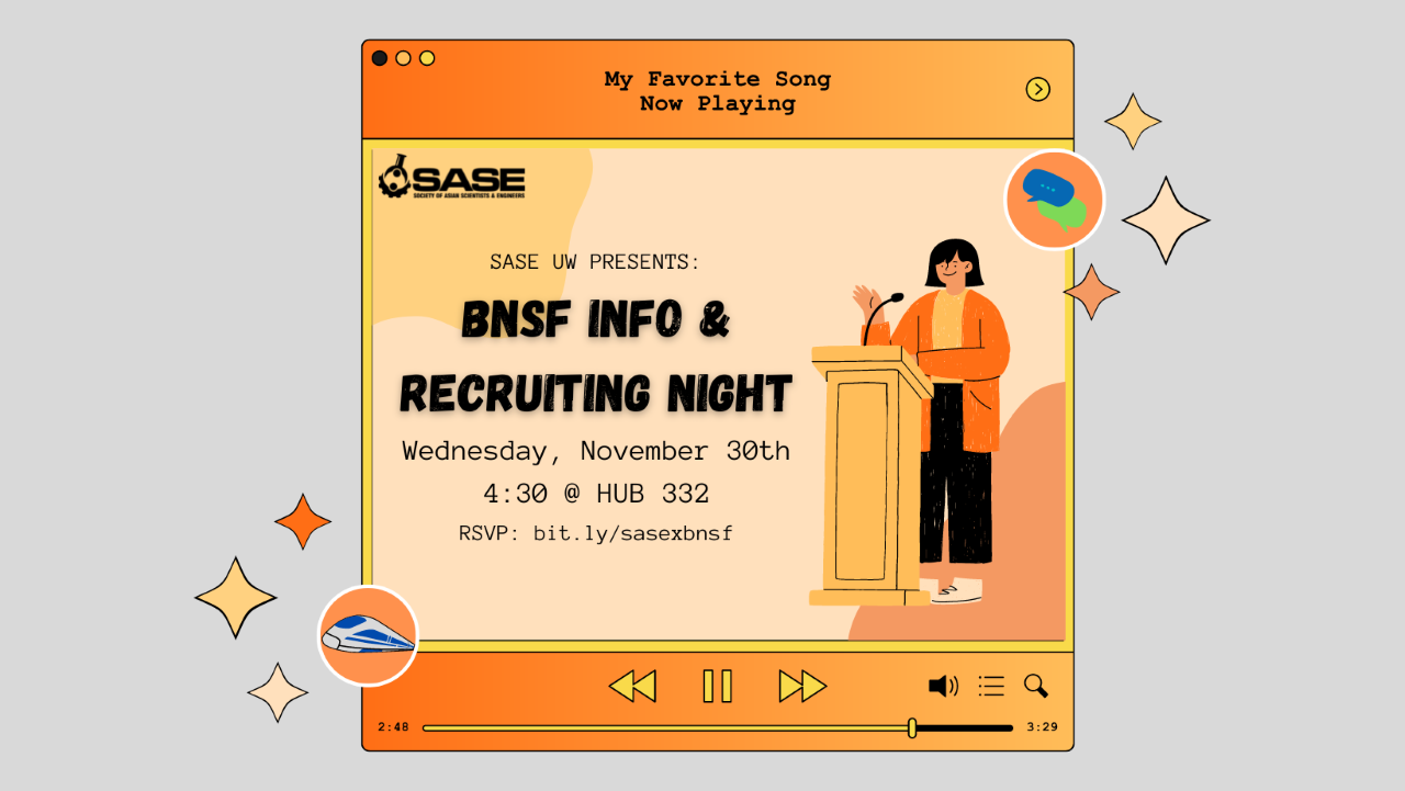 BNSF Railway is looking to promote opportunities within their company to students at UW. We are hosting a recruiting and informational night where students will get to hear from and talk to representatives ranging from engineering to HR.