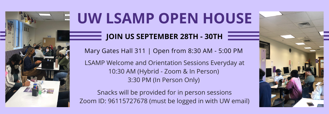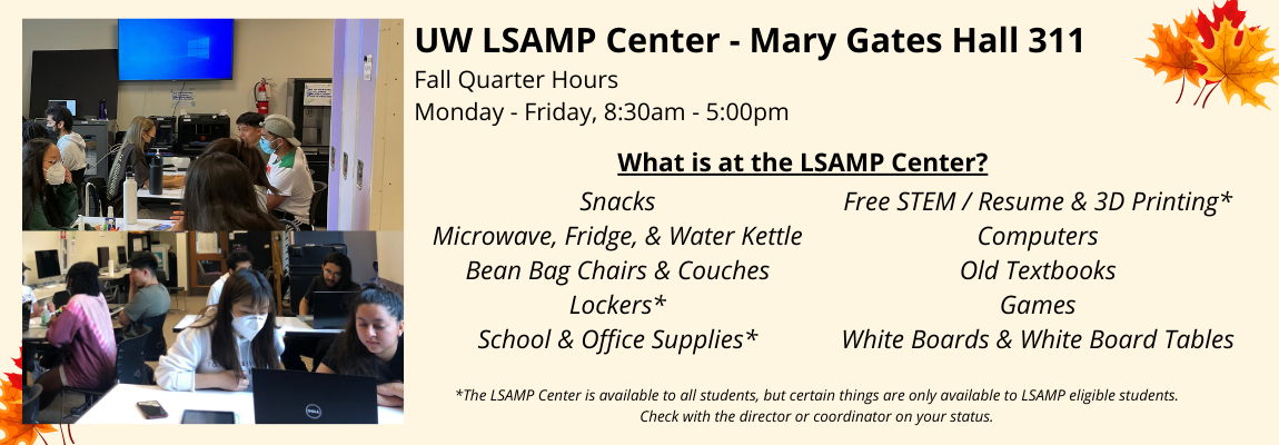 The UW LSAMP Center will be open Monday – Friday, 8:30am – 5:00pm this Fall. We are located in Mary Gates Hall 311. The LSAMP center is a place for students to study and relax. [cid:cc191a43-0a8e-4d13-94d6-681c7f0b4c3e]