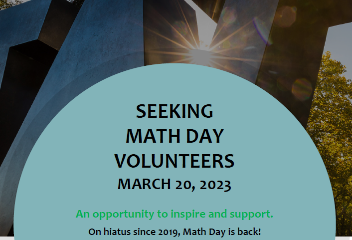 Also, if you haven't heard, the Dept. of Mathematics is hosting Math Day and is looking for volunteers. To view the full Math Day flyer, see the attached PDF.
