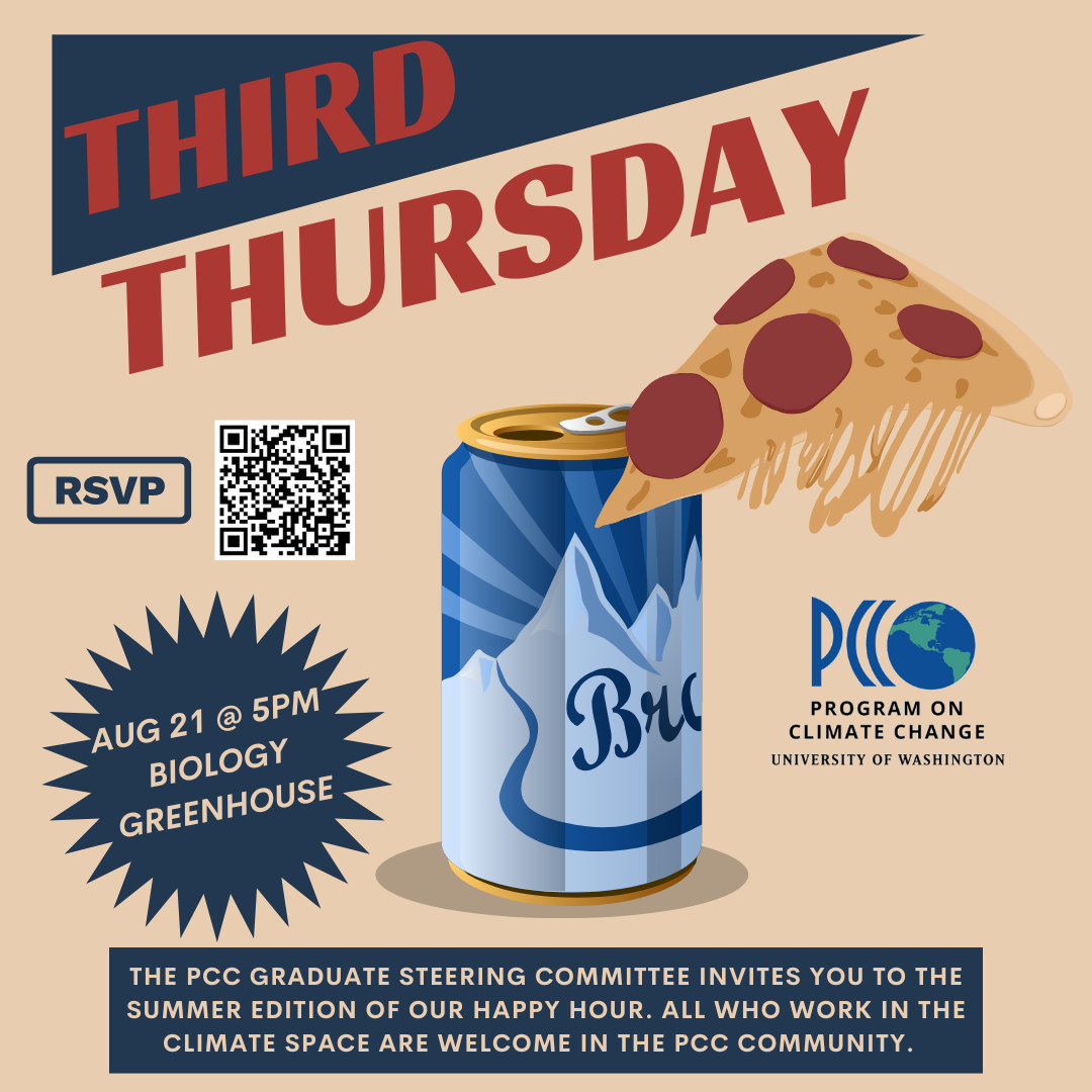 Happy end (ish) of summer quarter! Missing community and want an excuse to come to campus and see your colleagues? You're invited to the summer edition (part two) of our Program on Climate Change (PCC) Third Thursdays happy hour! This event will take place in the Biology Greenhouse (and surrounding outdoor space if the weather is nice) on Thursday, August 21st from 5 pm to 7 pm. To give us a sense of how many people to expect, if you plan on coming, please RSVP here<https://forms.gle/93HwgLSZAzdcZFu59> by Sunday, August 17th.