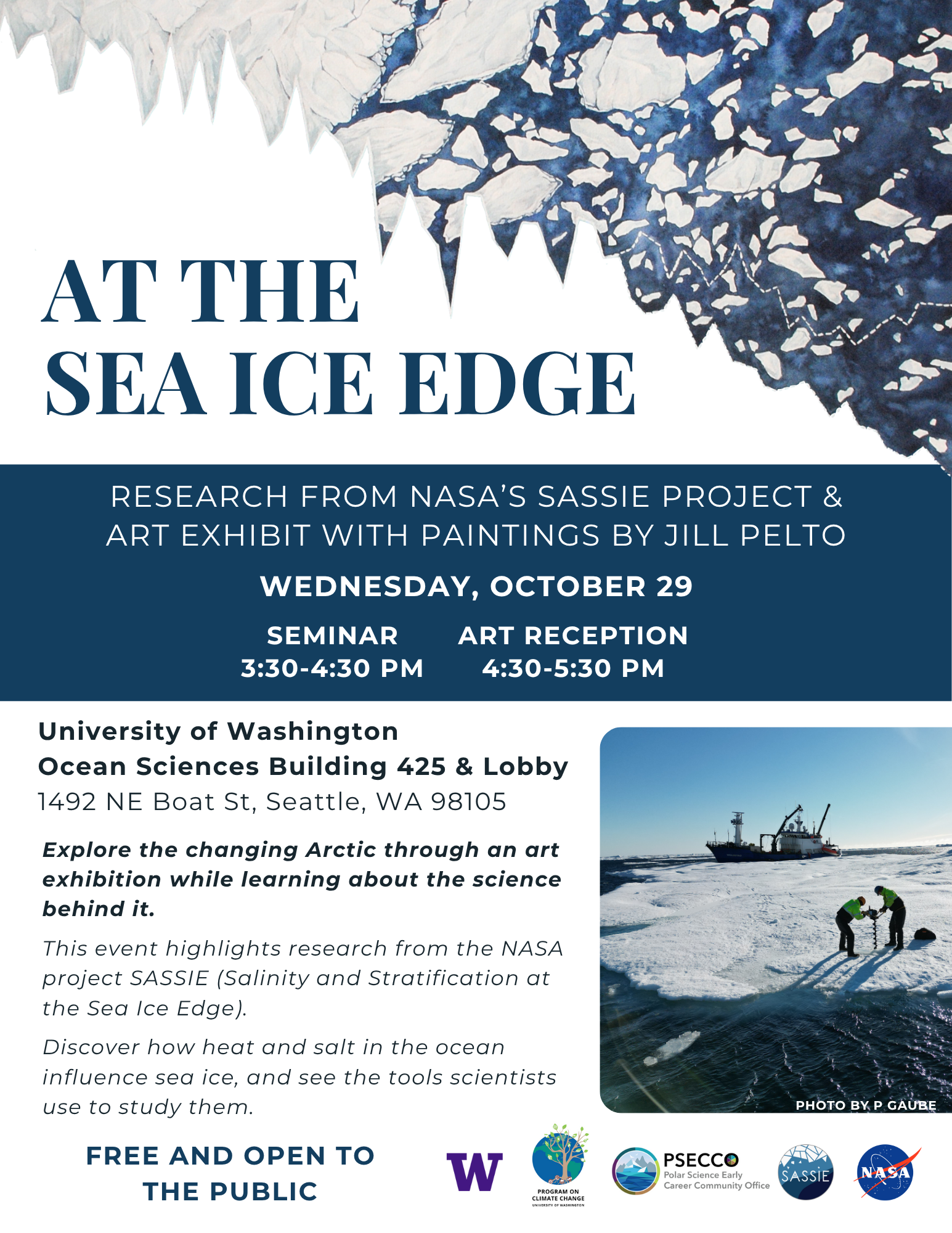 You are invited to come experience "At The Sea Ice Edge", an art + science collaboration with artist Jill Pelto designed to highlight research from NASA’s SASSIE (Salinity and Stratification at the Sea Ice Edge) project. In collaboration with members of the SASSIE science team, Jill has created a series of four paintings that convey the science of SASSIE and the impact of climate change on the Arctic, with each piece directly incorporating environmental data. This event is a debut of this collection of artwork and will include a seminar followed by a reception.