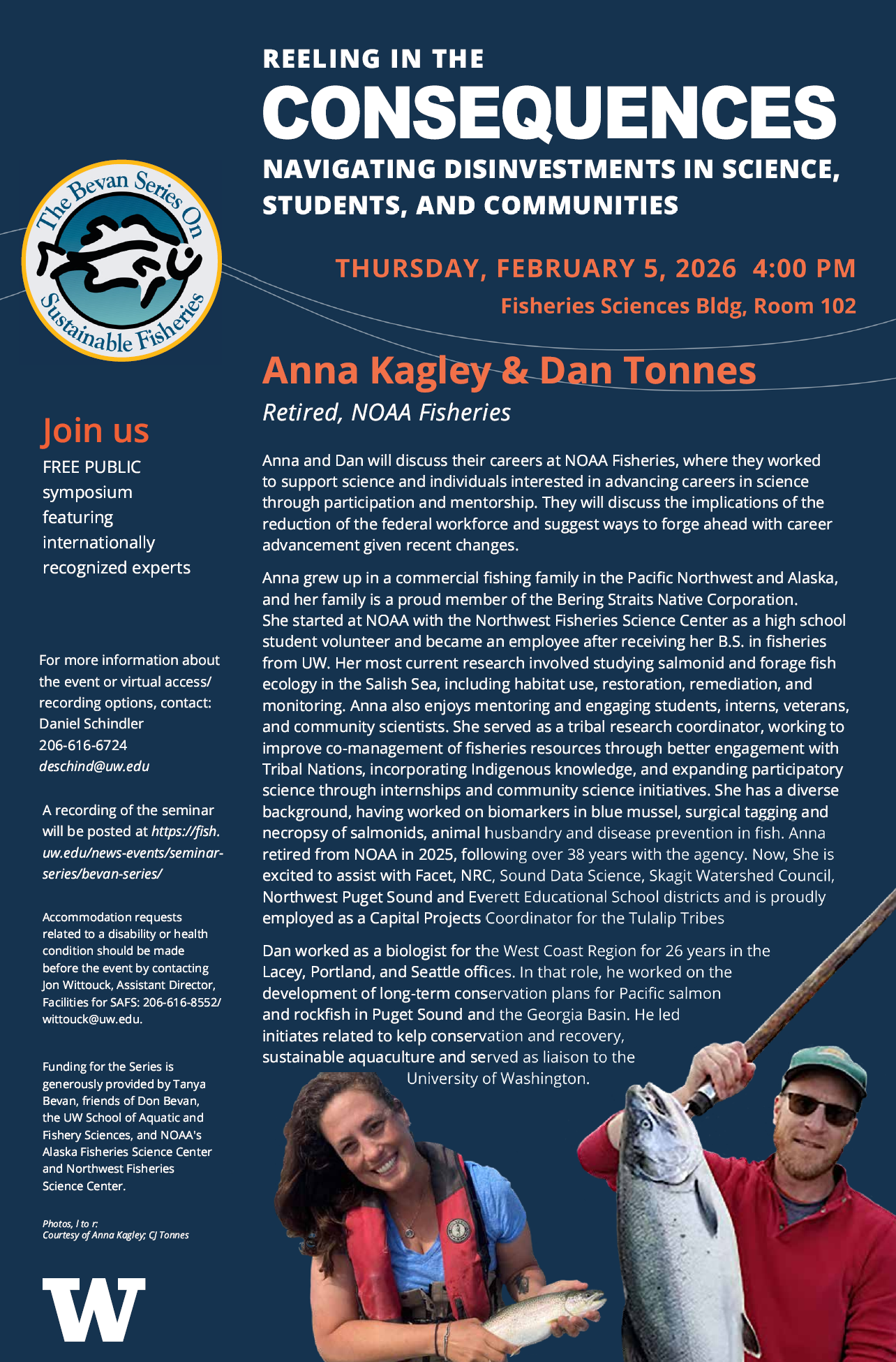 Tomorrow's Bevan Series seminar will be presented by Anna Kagley and Dan Tonnes. It is titled Reeling in the Consequences: Navigating Disinvestments in Science, Students, and Communities.