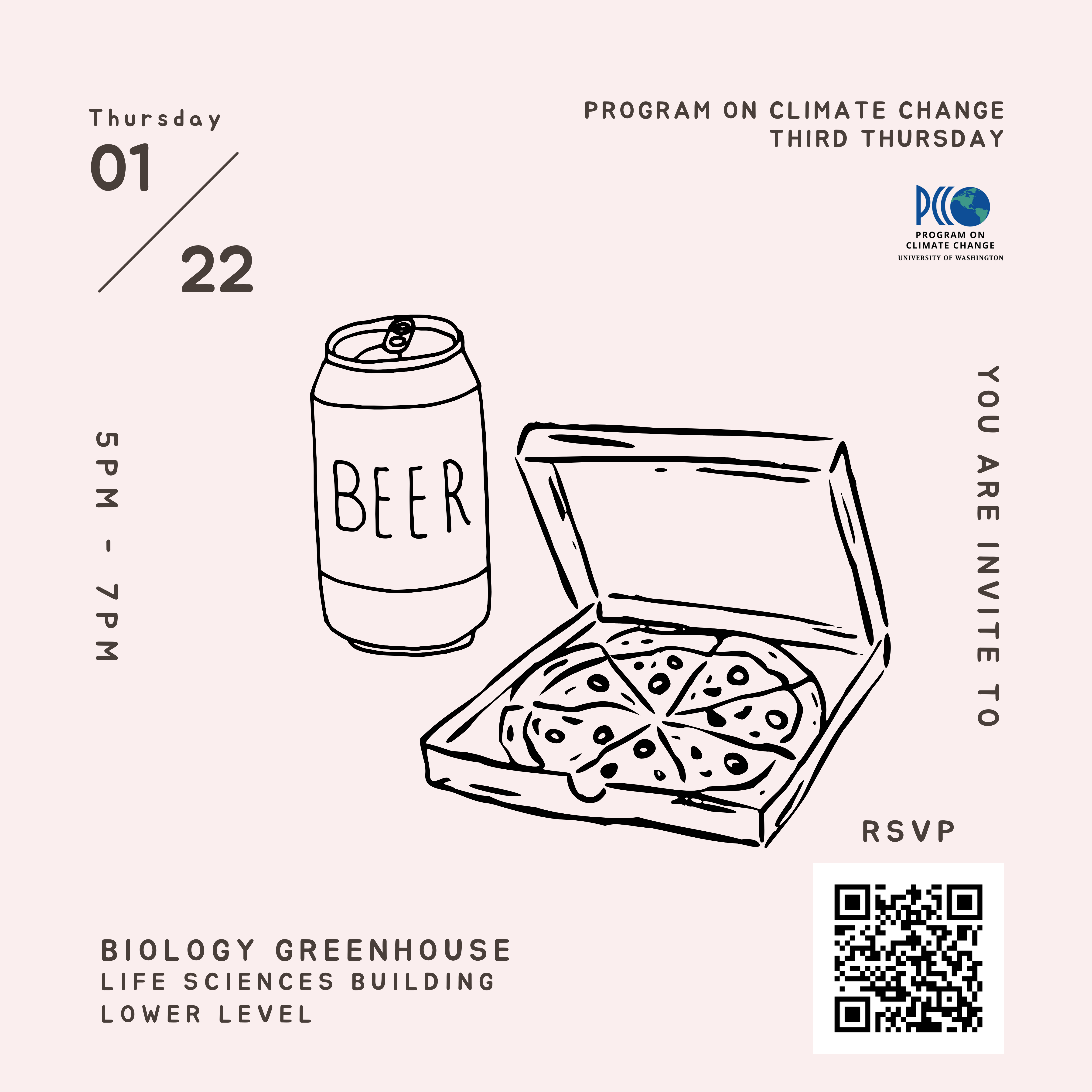 The PCC Graduate Steering Committee (P-GraSC) is hosting a happy hour with food and drink provided every Third Thursday. We believe building community among scientists and academics is more important now than ever, and we are doing this in an effort to foster more connections across the climate space here at UW. We aim to create these connections by giving folks from different disciplines a place to come together to chat, eat pizza, and look at cool plants.