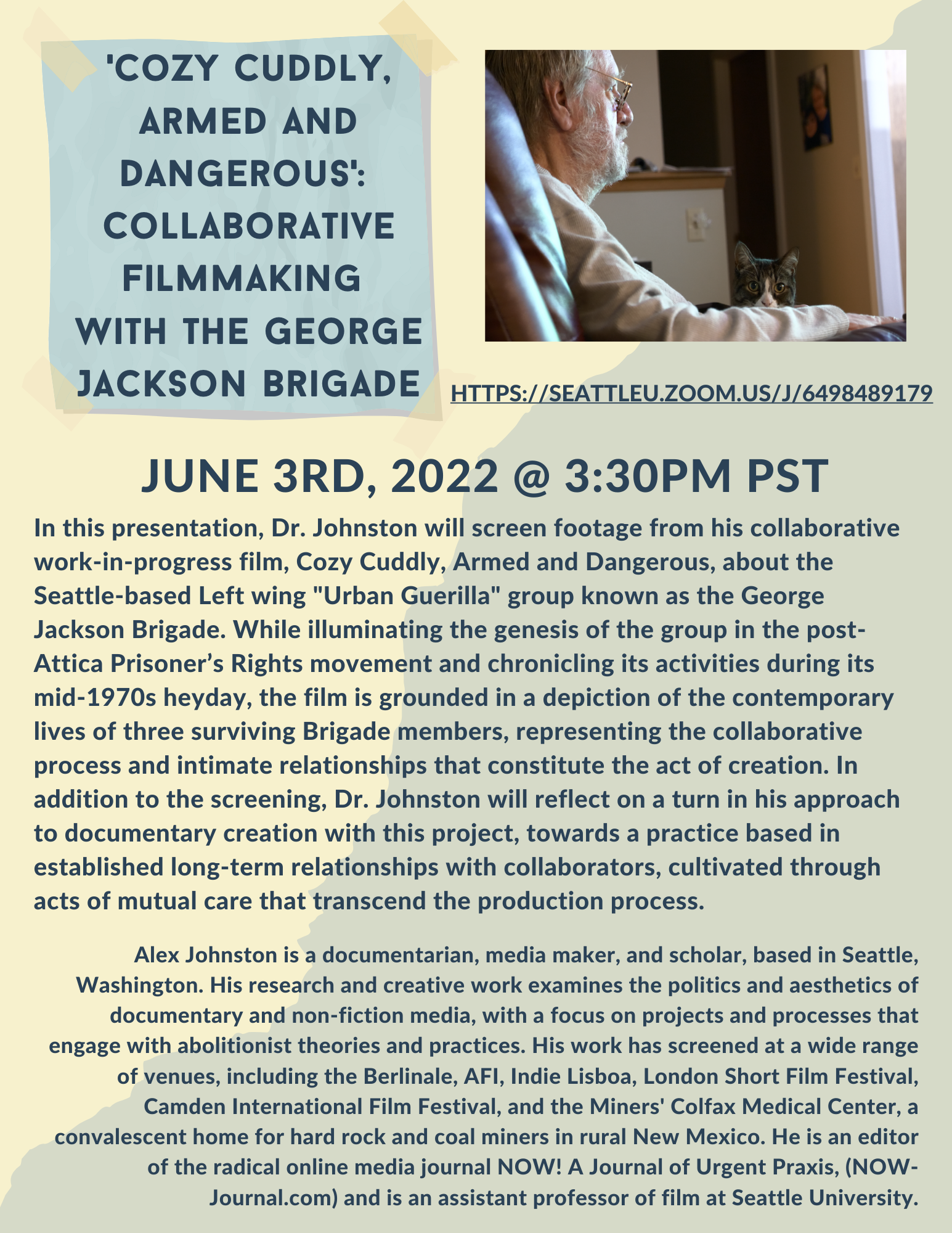 Name: 'Cozy Cuddly, Armed and Dangerous' Collaborative Filmmaking with the George Jackson Brigade June 3rd, 2022 @ 330pm PST In this presentation, Dr. Johnston will screen footage from his collaborative work-in-progress fi.png