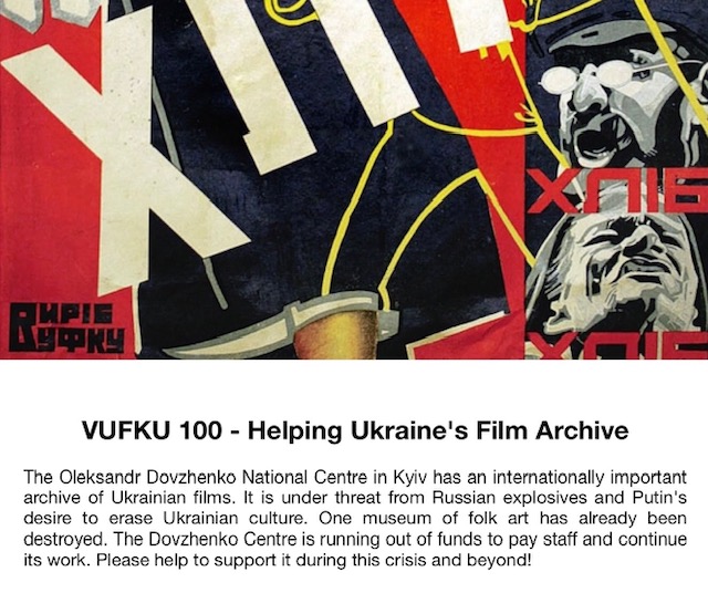 I am trying to raise funds for the Oleksandr Dovzhenko National Centre in Kyiv. Its precious archive of over 7000 Ukrainian and foreign films is under threat from Russian explosives and Putin's desire to destroy Ukrainian culture. Many of its staff have evacuated or joined up and it is very short of funds. I would appreciate it if you could spread the word to colleagues and friends, and in social media. In two days we have reached nearly half of our target! International donations can be made through Paypal.