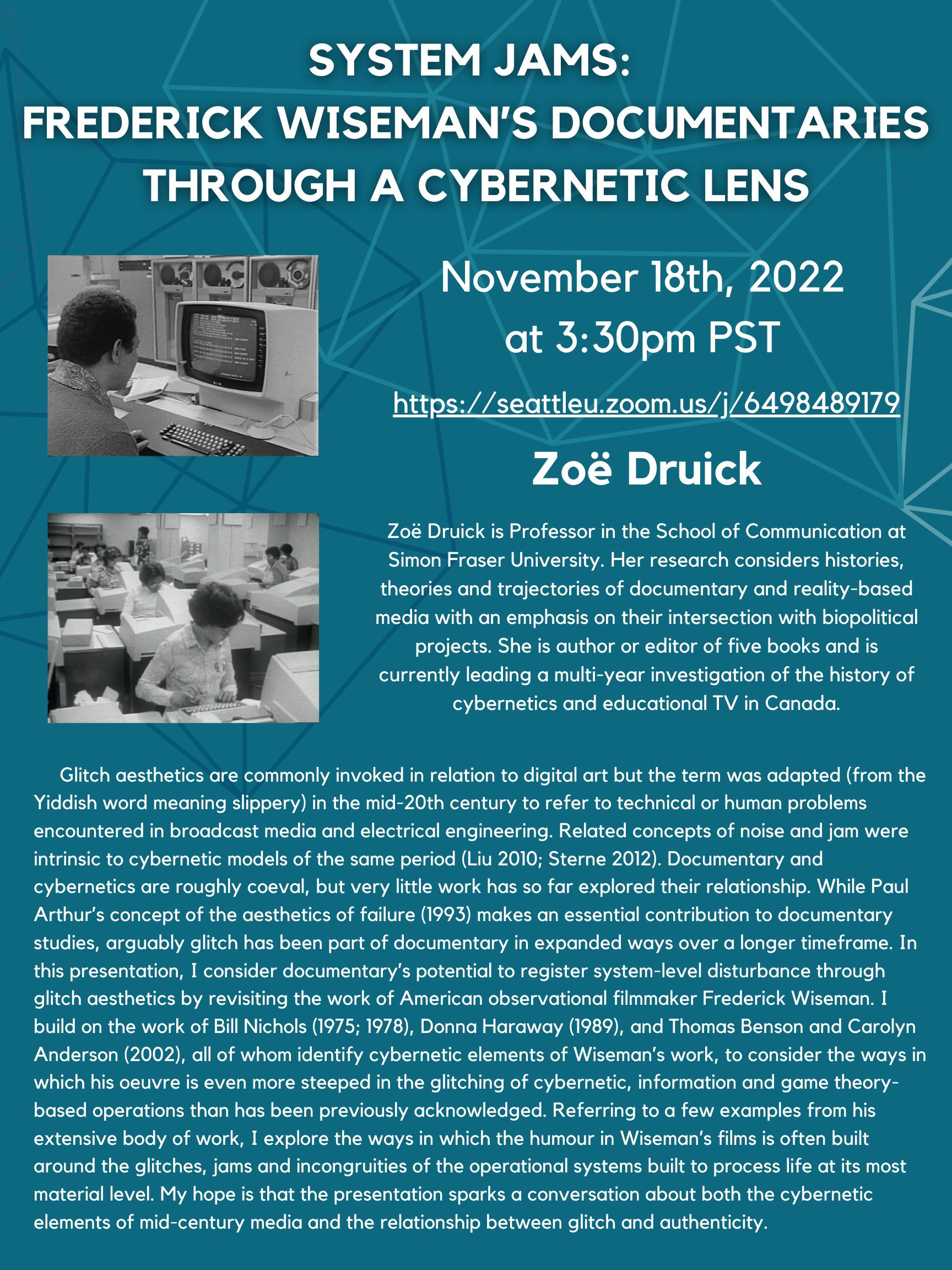Additionally, we still have two more events for 2022. On Friday, November 18th Dr. Druick will present “System Jams: Frederick Wiseman’s Documentaries Through a Cybernetic Lens” (flyer attached) and on December 2nd Dr. Johanna Goss will present “Ray Johnson, Mail Art, and Network Aesthetics.”