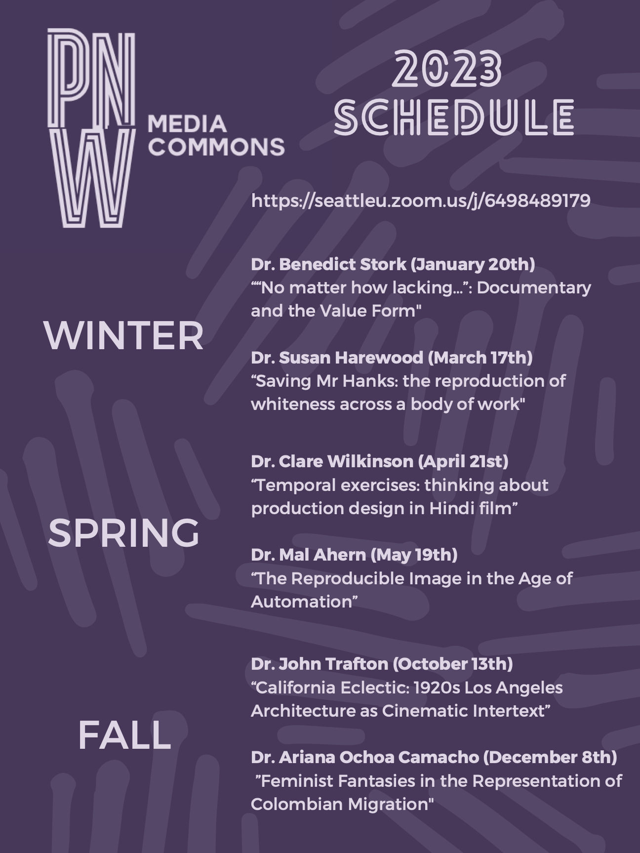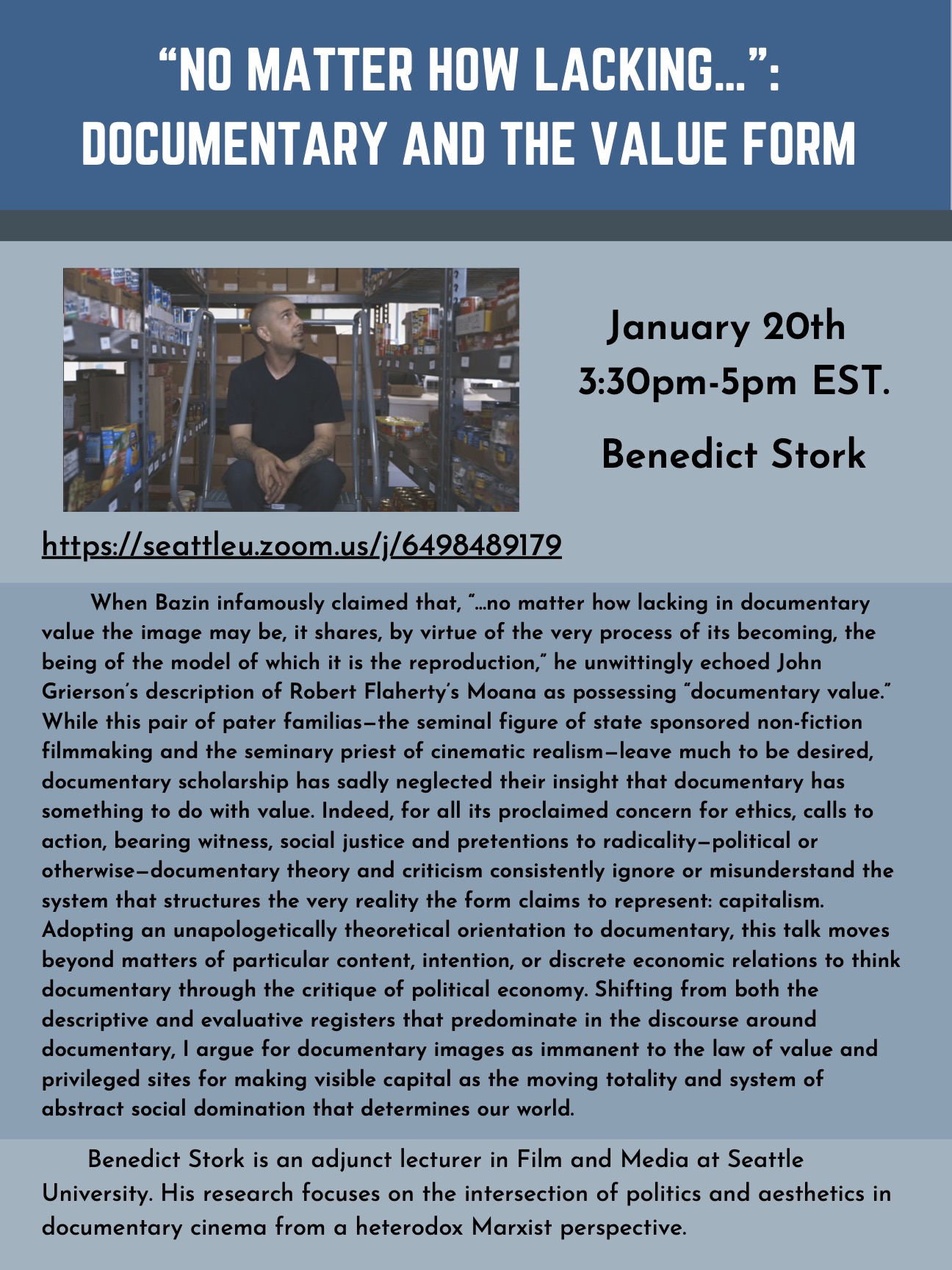 I hope you all had restful breaks. We have our first Pacific Northwest Media Commons event of 2023 coming up this Friday! Dr. Benedict Stork will present his work-in-progress talk ‘“No matter how lacking…”: Documentary and the Value Form’. See the attached flyers for the full details. You can also join our Facebook event by following this link: