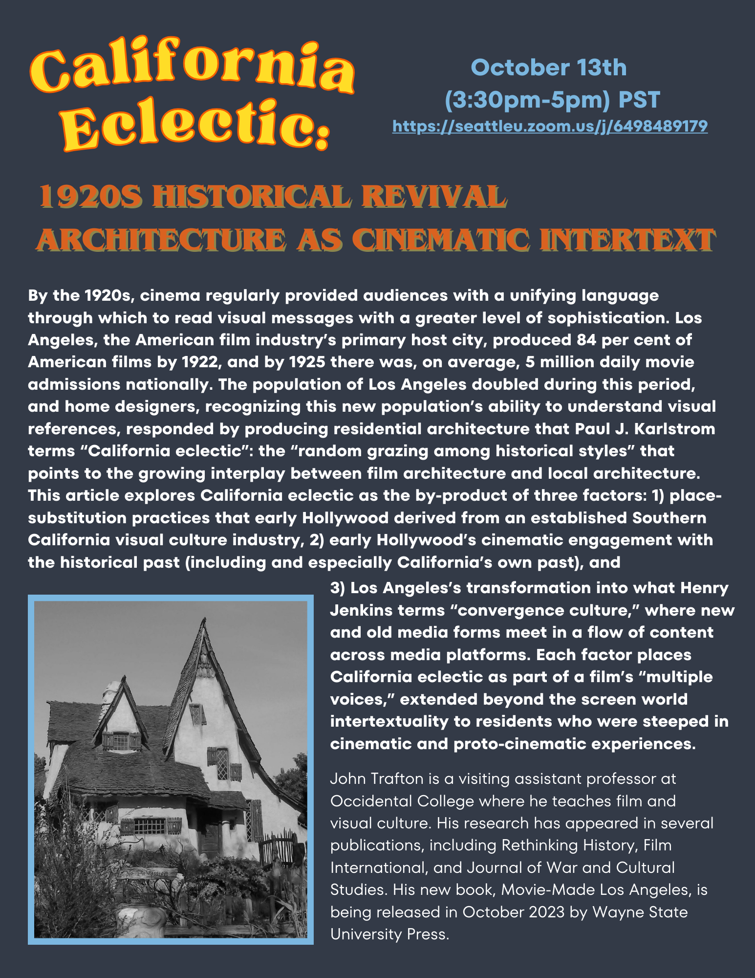 I hope you all had restful summers. We have our first Pacific Northwest Media Commons event of the academic year coming up this Friday! Dr. John Trafton will present his work-in-progress talk “California Eclectic: 1920s Historical Revival Architecture as Cinematic Intertext.” See the attached flyer for the full details. You can also join our Facebook event by following this link: