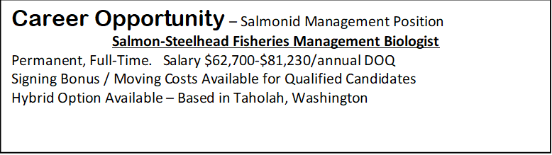 [Career Opportunity - Salmonid Management Position Salmon-Steelhead Fisheries Management Biologist Permanent, Full-Time. Salary $62,700-$81,230/annual DOQ Signing Bonus / Moving Costs Available for Qualified Candidates Hybrid Option Available - Based in Taholah, Washington]Quinault Indian Nation